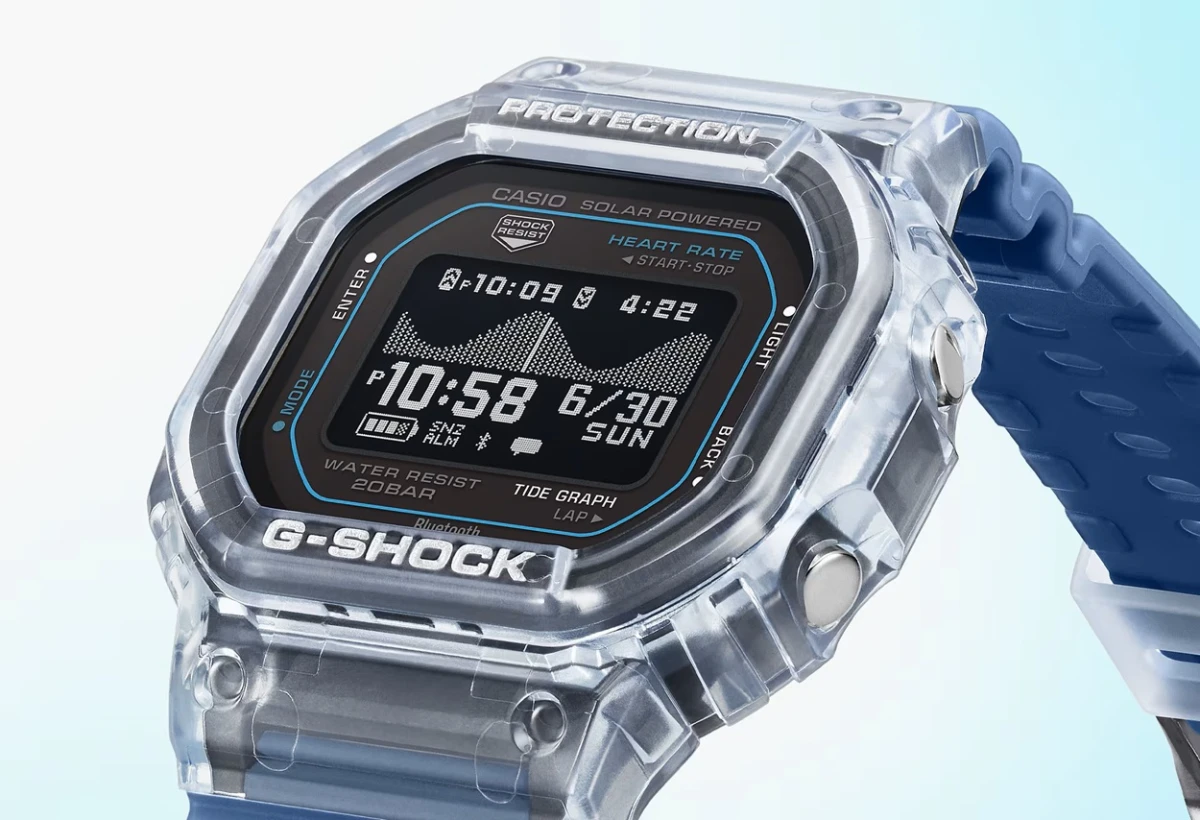 Компания Casio пополнила ассортимент часов моделями G-Shock G- GBX-H5600-1 и GBX-H5600-2, которые получили безель из полупрозрачной смолы. Новинка также характеризуется корпусом из армированного углеволокном полимера массой 47 граммов и размерами 51,1:44,5:17,3 мм, водонепроницаемостью до 200 метров, высококонтрастным экраном MIP LCD, поддержкой Bluetooth для сопряжения со смартфоном, отображением приливов на 3300 сёрф-локациях, оптическим датчиком для измерения сердечного ритма, трёхосевым акселерометром, функцией измерения уровня насыщения крови кислородом, отслеживанием качества сна, анализа тренировок и состояния организма, поддержкой солнечной зарядки, автономностью до 35 часов или до 11 месяцев в энергосберегающем режиме, мировым временем до 38 часовых поясов и светодиодной подсветкой Super Illuminator. Цена часов на дебютном японском рынке составляет эквивалент 275 долларов.