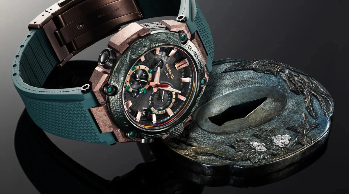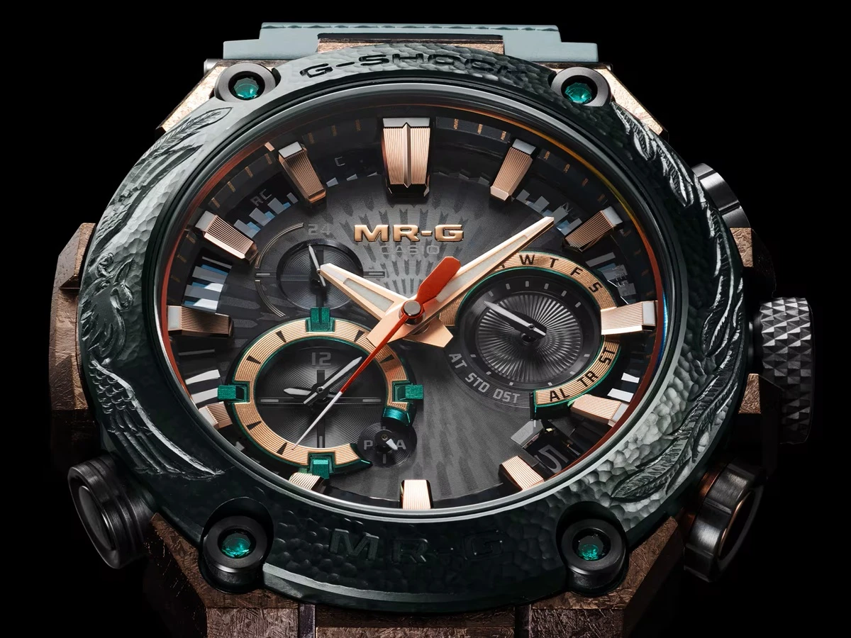 Компания Casio пополнила ассортимент премиальных часов моделью G-Shock MRG-B2000KT-3AJR, которая выйдет ограниченным тиражом в 800 штук. Новинка характеризуется безелем из титана с DLC-покрытием и вручную выгравированным рисунком, циферблатом с градуированным напылением, четырьмя изумрудами, металлическим корпусом, сапфировым стеклом, заводной головкой и кнопками плакированной защитой, ремешком Durasoft, титановой застёжкой, габаритами 54,7:49,8:16,9 мм, массой 138 граммов, зарядкой Tough Solar, радиосинхронизацией времени Multiband 6, адаптером Bluetooth для сопряжения со смартфоном, водонепроницаемостью 20 бар, антимагнитной защитой и светодиодной подсветкой Super Illuminator. Цена часов на дебютном японском рынке составляет эквивалент 6060 долларов.