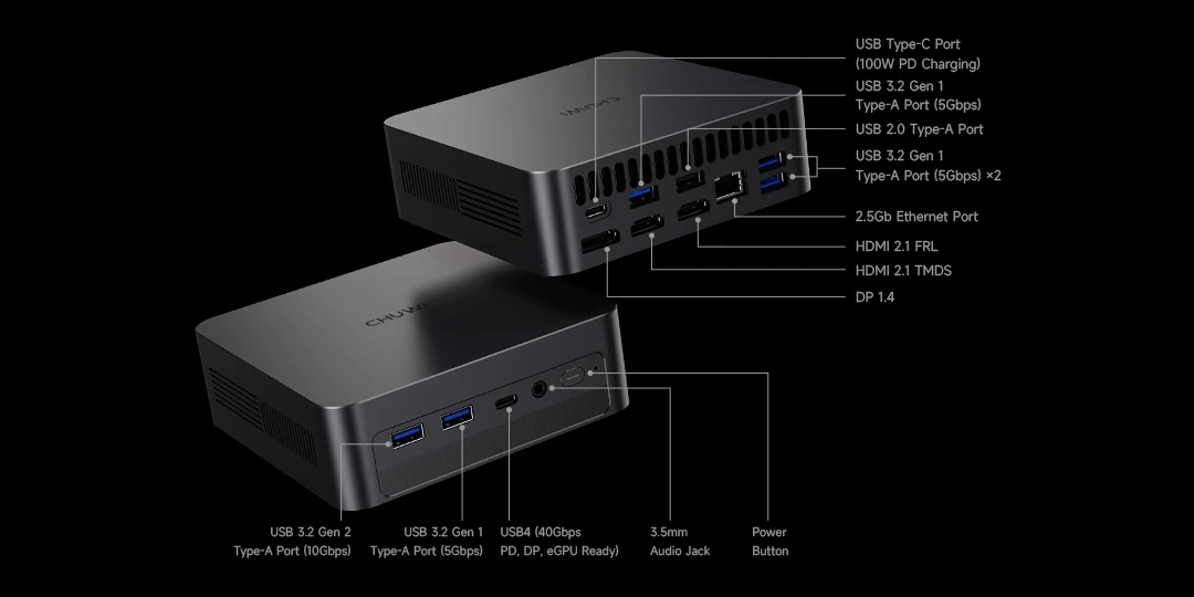 - CHUWI AuBox X (Ultra 5 226V) - С 97 TOPS общей производительности, графикой Intel Arc 130V и SSD 512 ГБ PCIe 3.0, эта версия идеально подходит для повседневной работы, офисных задач, воспроизведения 4K и лёгкого редактирования фото. $699
