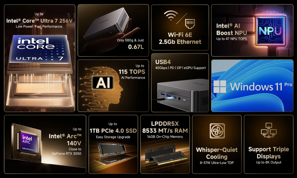 - CHUWI AuBox X (Ultra 7 256V) - С увеличением до 115 TOPS, более быстрой графикой Arc 140V и SSD 1 ТБ PCIe 4.0, версия Ultra 7 легко справляется с более требовательными творческими задачами — такими как рендеринг видео, AI-редактирование фото и лёгкое 3D-моделирование. $829