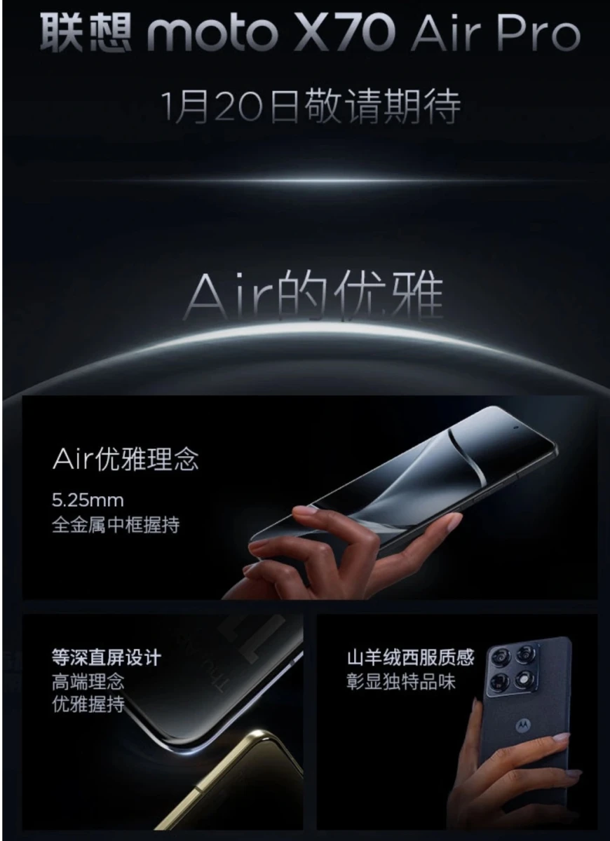 Компания Motorola опубликовала подробности о смартфоне Moto X70 Air Pro, официальный релиз которого запланирован на 20 января. Производитель подтвердил наличие сверхтонкого корпуса с металлической рамкой, защиты от воды и пыли в соответствии со степенями IP68 и IP69, производительного процессора Qualcomm Snapdragon 8 Gen 5, плоского экрана с люминесцентным материалом BOE Q10, ультратонкими рамками и разрешением 1,5K, подэкранного ультразвукового сканера отпечатков пальцев и двойных динамиков BOSE.