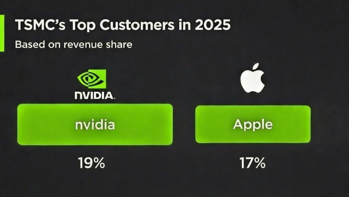 NVIDIA официально обогнала Apple и стала крупнейшим клиентом TSMC — стремительное наращивание ИИ-инфраструктуры со стороны NVIDIA привело к беспрецедентному росту спроса на процессоры. TSMC давно является ключевым мировым поставщиком полупроводников для компаний без собственных фабрик и фактически обеспечивает рынок вычислительными мощностями для ИИ, развитие которых исторически опиралось на закон Мура. Среди клиентов TSMC на протяжении нескольких лет лидировала Apple благодаря активному внедрению передовых решений для своих процессоров серий A и M. Однако на фоне ажиотажа вокруг искусственного интеллекта NVIDIA резко увеличила объёмы заказов и за несколько лет сместила Apple с первого места по объёму сотрудничества.