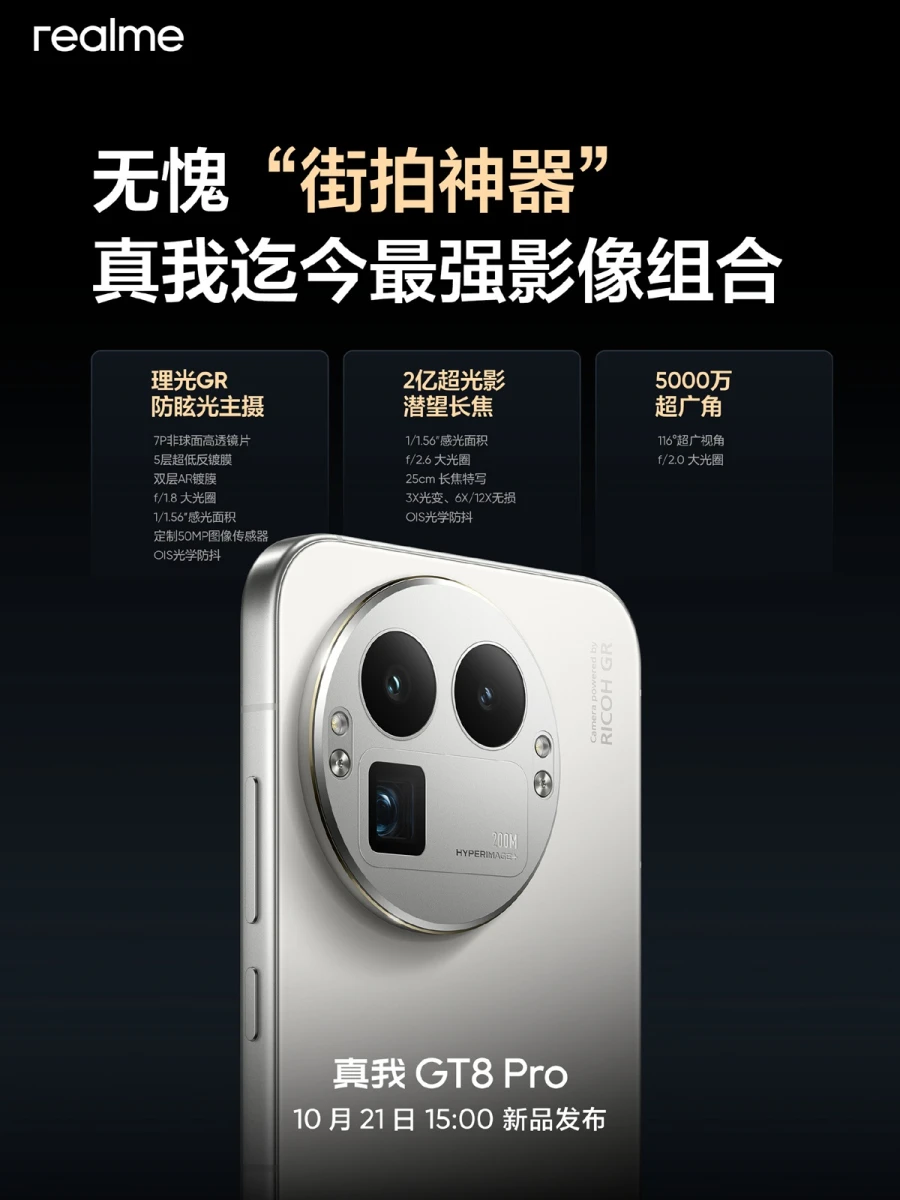 Компания Realme раскрыла подробные характеристики смартфона Realme GT 8 Pro, который будет представлен 21 октября. Итак, аппарат получит тройную основную камеру с модулями на 50 Мп (Ricoh GR с фирменным антибликовым покрытием и оптическая стабилизация), 200 Мп (телеобъектив с 3-кратным оптическим приближением и OIS) и 50 Мп (сверхширик), топовую однокристальную систему Snapdragon 8 Elite Gen 5 от Qualcomm, экран Sky Dome на основе люминесцентного материала BOE Q10+ с разрешением 2K, кадровой частотой 144 Гц и пиковой яркостью 4000 нит, а также белую, синюю и зеленую расцветки корпуса.