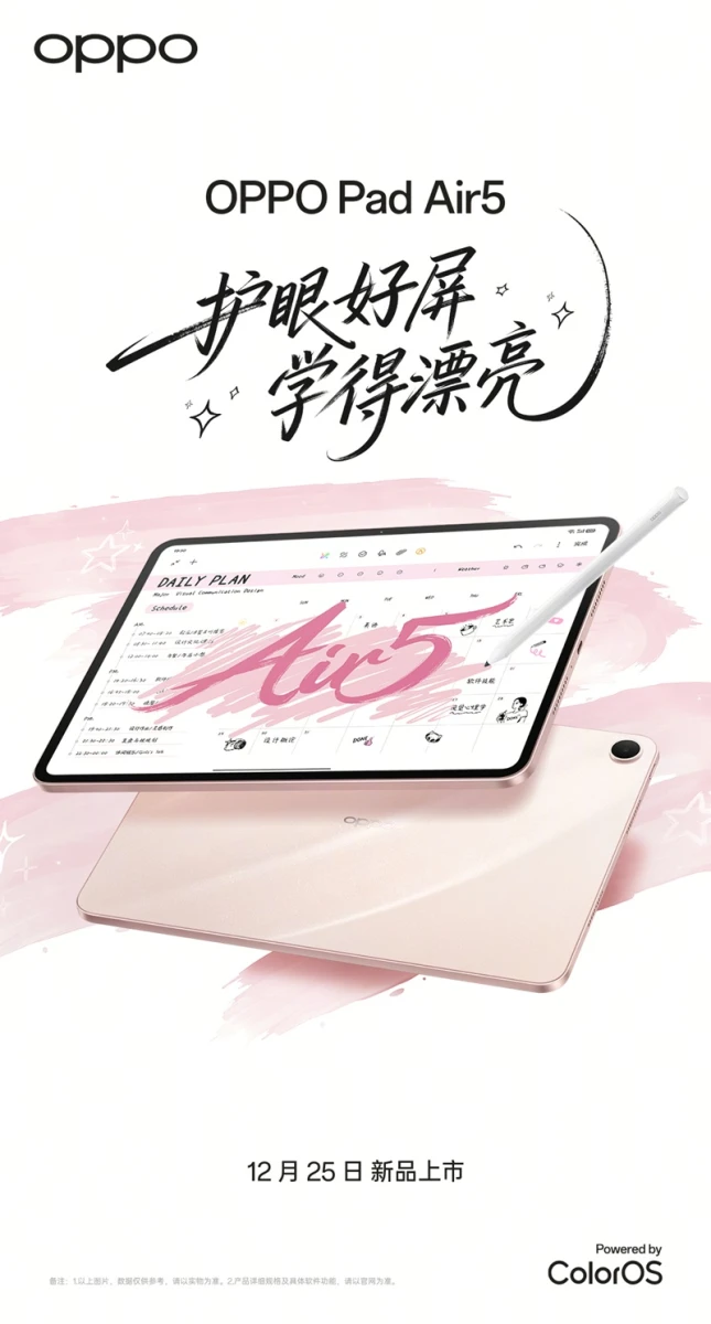 Компания OPPO объявила, что уже 25 декабря будет представлен планшет Pad Air 5. Производитель уже подтвердил наличие экрана с разрешением 2,8K, предустановленной прошивки ColorOS, батареи ёмкостью 10050 мАч, модема для сотовых сетей пятого поколения, корпуса в серой, бежевой и розовой расцветках, 8 ГБ оперативной памяти и 128 ГБ флеш-памяти.