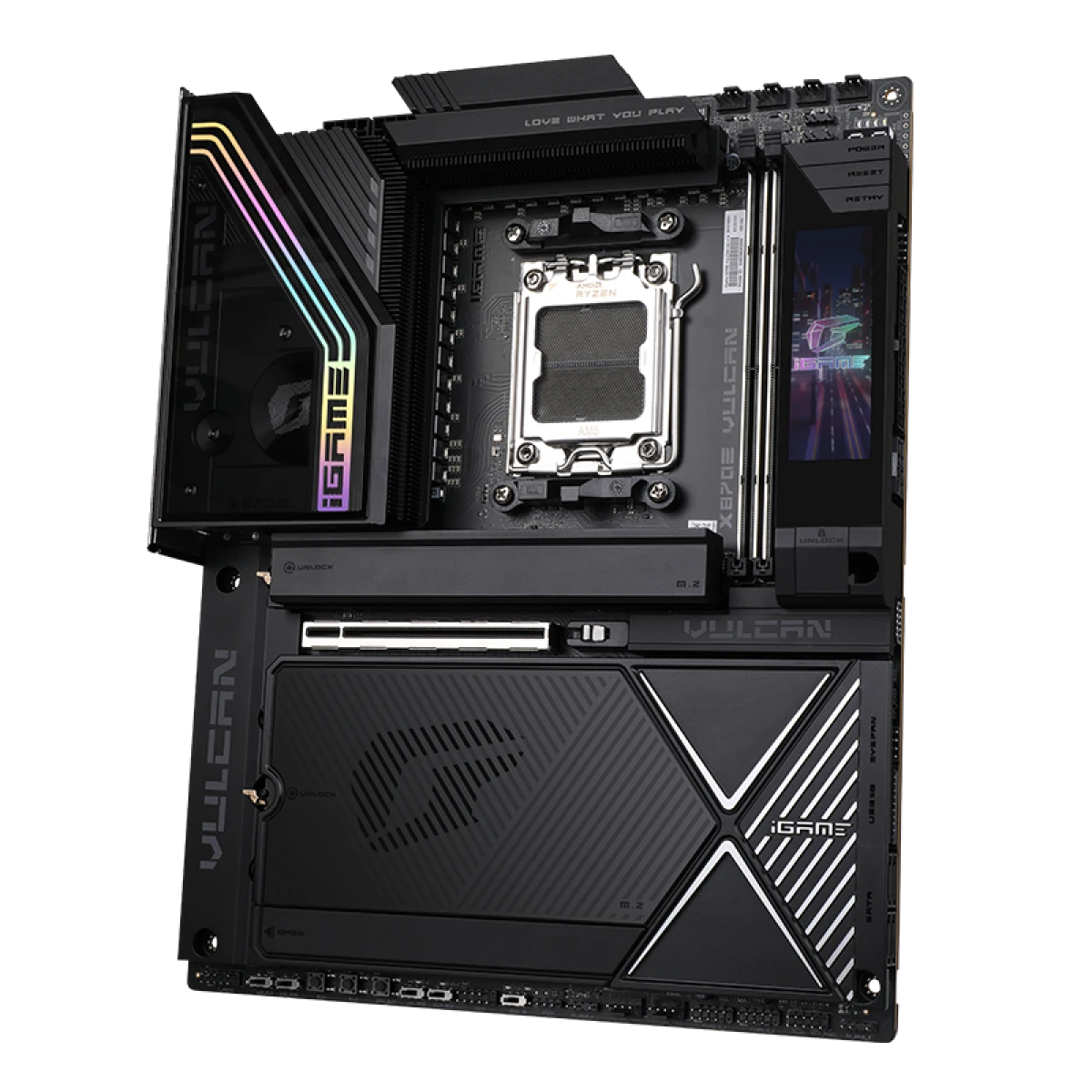 Компания Colorful пополнила ассортимент флагманских материнских плат моделью iGame X870E Vulcan OC V14, которая предназначена для чипов Ryzen с разъемом AM5. Новинка характеризуется размещенным около ОЗУ экраном с кнопками, двумя слотами для оперативной памяти DDR5-10000 и выше, 22-фазной подсистему питания, множеством кожухов, некоторые из которых нужны чисто для дизайна, пятью слотами для твердотельных накопителей формата M.2 (три с поддержкой PCIe 5.0), двумя портами USB4 и адаптером беспроводной связи Wi-Fi 7. Цена и дата начала продаж платы будут объявлены позже.