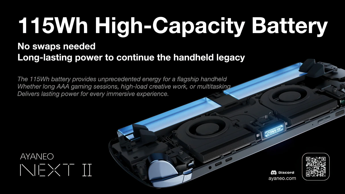 Компания Ayaneo пополнила ассортимент портативных игровых приставок моделью Next 2, которая основана на 16-ядерном процессоре AMD Ryzen AI Max+ 395 с тактовой частотой до 5,1 ГГц и встроенным графическим ускорителем Radeon 8060S. Второй особенностью новинки стал аккумулятор ёмкостью 115 Втч, в то время как до этого рекордный элемент питания в портативных консолях имел ёмкость "всего" 80 Втч.