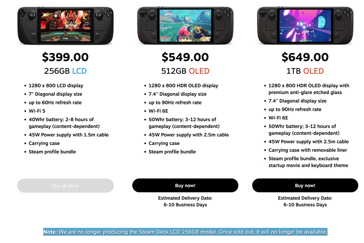 Самая доступная версия Steam Deck, LCD-модель за 399 долларов, больше недоступна для приобретения. И, судя по информации на официальном сайте Steam Deck, уже не вернётся в продажу. Под перечнем доступных модификаций указано примечание о том, что компания больше не производит Steam Deck LCD с накопителем на 256 ГБ, и после распродажи складских запасов эта версия окончательно исчезнет с рынка. Решение Valve постепенно отказаться от Steam Deck с LCD-экраном выглядит разочаровывающим, поскольку теперь самым дешёвым вариантом консоли стала версия с OLED-дисплеем и накопителем на 512 ГБ, цена которой составляет 549 долларов, что заметно дороже прежней базовой модели.