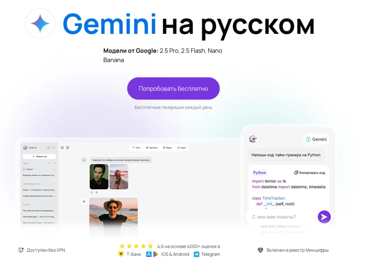 Для пользователей в Российской Федерации доступ к преимуществам Gemini актуален через проверенный сервис Chad. Этот российский портал открывает возможности популярных нейронных сетей и предлагает несколько тарифов, различающихся по количеству слов и набору функций. Чем выше стоимость тарифа, тем соответственно больше возможностей открывается для пользователя, большее число запросов и многое другое, о чем можно узнать на сайте портала.