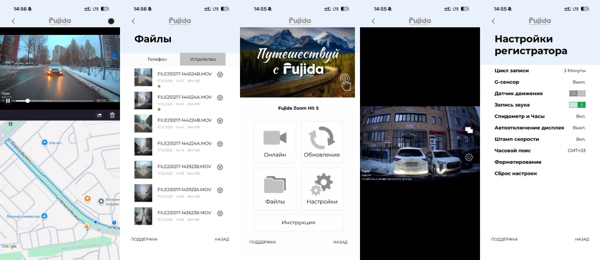 Тестируемый сегодня видеорегистратор Fujida Zoom Hit S Duo WiFi идет в комплекте с тыльной камерой, используемой для помощи во время парковки и фиксации дорожного движения позади автомобиля. Оснащено устройство GPS модулем, оповещающим о приближении к комплексам видеофиксации в России и СНГ. За работу и двухканальную видеосъемку в разрешении Full HD с поддержкой WDR отвечает производительный процессор Mstar 8339 и матрица GalaxyCore GC 2053. К видеорегистратору можно подключаться при помощи фирменного мобильного приложения для обновления базы данных и загрузки записанных файлов в память смартфона.