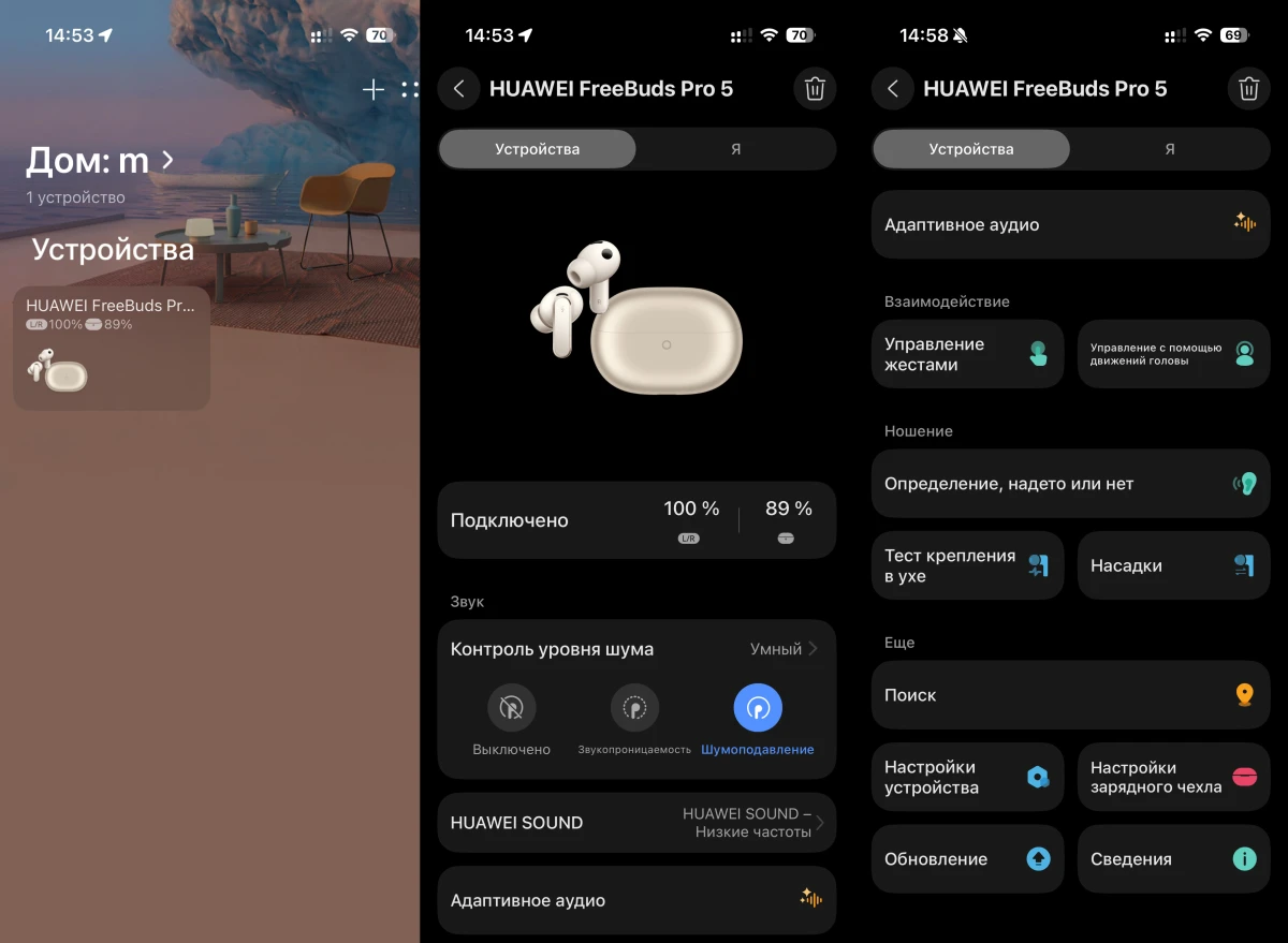 Среди необычных решений, которые мы не встречали ранее, — тест слуха. Изначально такая возможность была и ранее, но технология позволяла понять лишь качество посадки амбушюров и наушников — подходит набор насадок или их лучше заменить. В пятом поколении добавили возможность проверки слуха, которая дает понять, есть ли у вас нарушения или нет. Правда, для этого нужно специальное приложение Huawei Innovation Research.