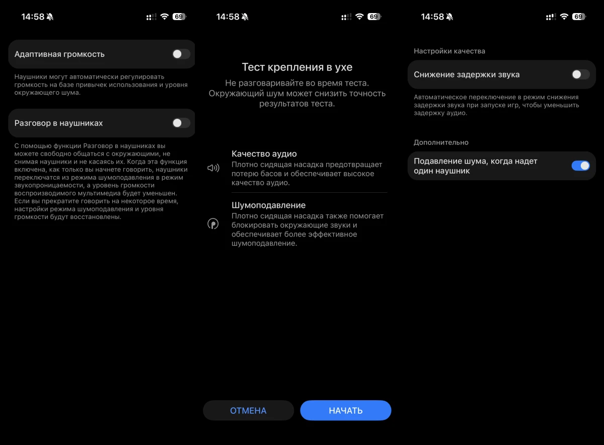 Но главное здесь — забота о посадке. В комплект входят силиконовые насадки четырех размеров — от XS до L, амбушюры размера M уже установлены. А вот пенные насадки, которые были в прошлом поколении, теперь исчезли — жаль, они были неплохие и обеспечивали довольно удобную посадку.