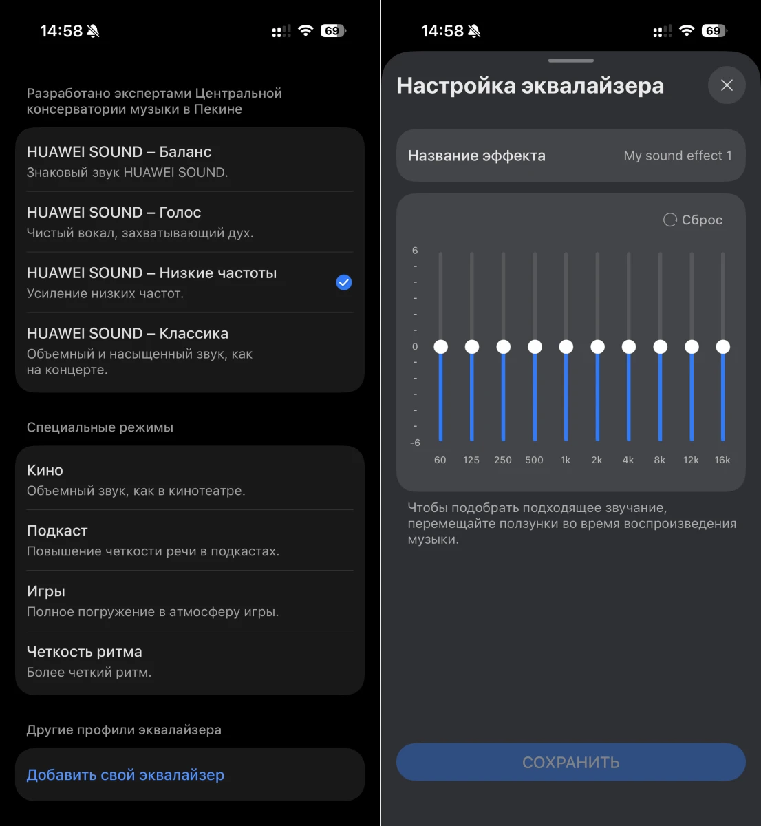 В связке с технологией NearLink, кодеком L2HC 5.0 и смартфоном HUAWEI наушники выдают Lossless-звук с битрейтом до 4,6 Мбит/с. Звучит всё круто, но для этого нужны FLAC-треки или хотя бы Deezer — «Спотик», Яндекс Музыка и VK не подойдут. Если соблюдать все условия, звук и правда получается хорошим, если не отличным: чувствуется плотный бас и четкое распределение инструментов в сложных партиях, голос при этом явно выделяется, а скрипка приятно приправляет это оперное блюдо.