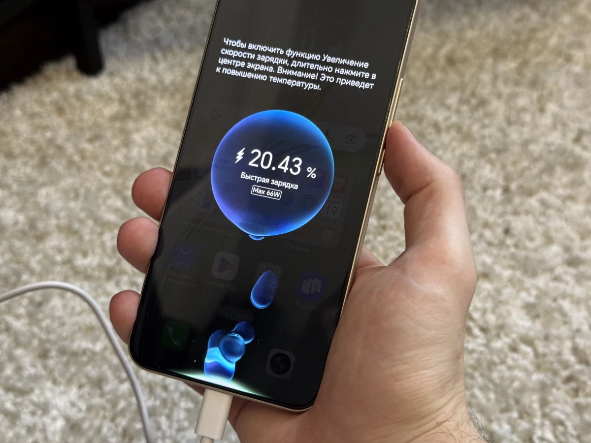 Внутри всё на уровне: телефон, скрепка для извлечения SIM-лотка, документация, кабель USB-A—USB-C длиной около метра, зарядное устройство SuperCharge на 66 Вт и чехол. Защитный кейс простенький: мягкий, тонкий и непрозрачный, но тактильно приятный, хотя быстро покрывается следами от пальцев.