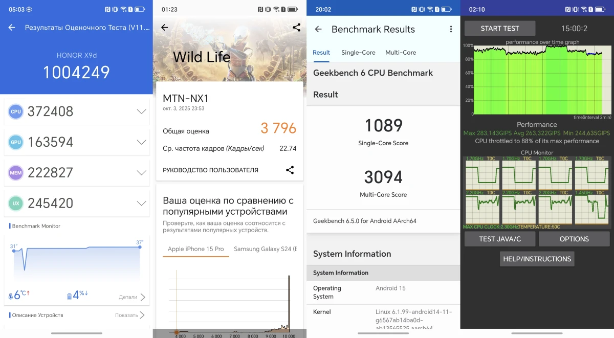 Чип — не лидер по производительность, да и ориентирован он не на рекорды, а на стабильную и предсказуемую работу под нагрузкой. В AnTuTu (v10) смартфон набирает около 1 миллиона баллов, а в GeekBench 6 — 1 тысячу и 3 тысяси (одноядерный и многоядерный режимы соответственно). Да, по цифрам это не уровень более топового Snapdragon 7 Gen 3, но в повседневных сценариях разница ощущается минимально: интерфейс работает плавно, приложения открываются быстро, а переход между ними происходит без задержек. Поэтому в повседневной эксплуатации Honor X9d показывает себя уверенно.
