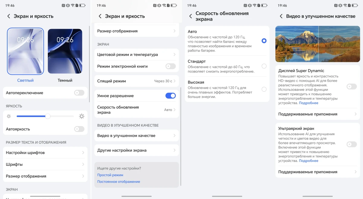 Так что картинка получается сочной и яркой, а температура экрана близка к эталонным дневным 6500К (по замерам профильных СМИ). Но если изображение покажется недостаточно насыщенным, можно включить «Яркий» цветовой профиль. И важно: если вы чувствительны к ШИМ, то переживать не стоит, здесь он 3840 Гц, а значит на низкой яркости экран не мерцает.