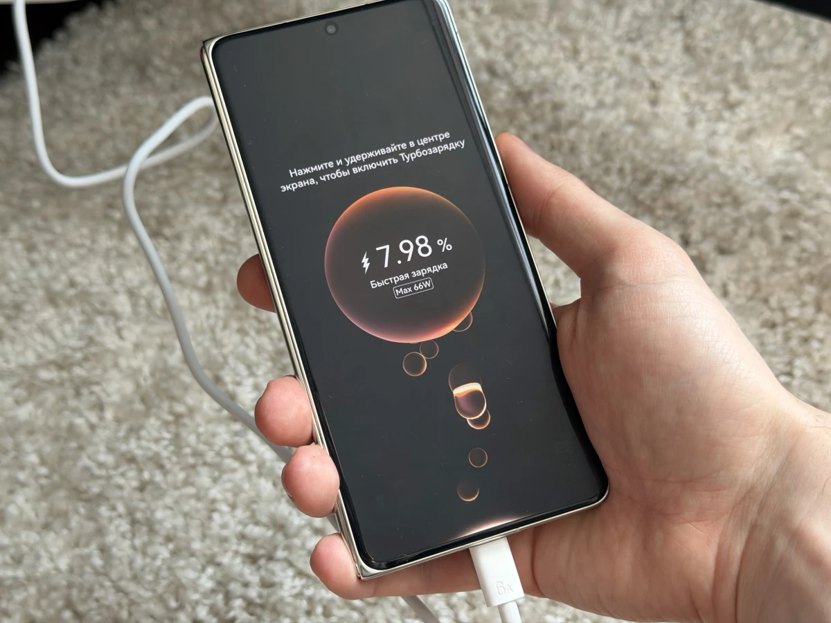 Заряжается быстро. В случае полной разрядки аккумулятор за 15 минут впитает в себя около 50%, а на полную зарядку по проводу уйдет около 45 минут. Главное использовать комплектный адаптер на 66 Вт. Можно и беспроводным методом, но так дольше — максимум смартфон может принять 50 Вт.