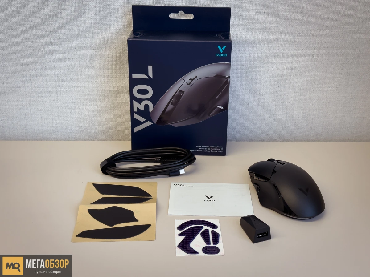 Коробка из плотного картона с изображением мышки и данными по техническим характеристикам. Комплект включает сменные ножки скольжения, интерфейсный кабель, переходник для адаптера и сам адаптер, грипсы, руководство пользователя.