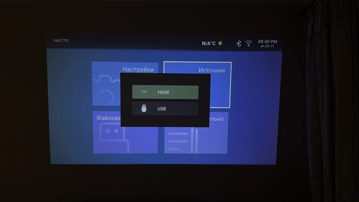 Меню настроек устройства выполнено в удобном и наглядном формате: все разделы грамотно структурированы, что упрощает управление различными функциями. Здесь можно легко настроить параметры беспроводного соединения Wi-Fi, Bluetooth или функции проецирования изображения. Кроме того, предлагается выбор различных методов коррекции трапецеидальных искажений, включая автоматическую регулировку фокусировки и бесшовное масштабирование изображения. Все эти возможности подчеркивают ориентацию системы на создание максимально комфортного пользовательского опыта.