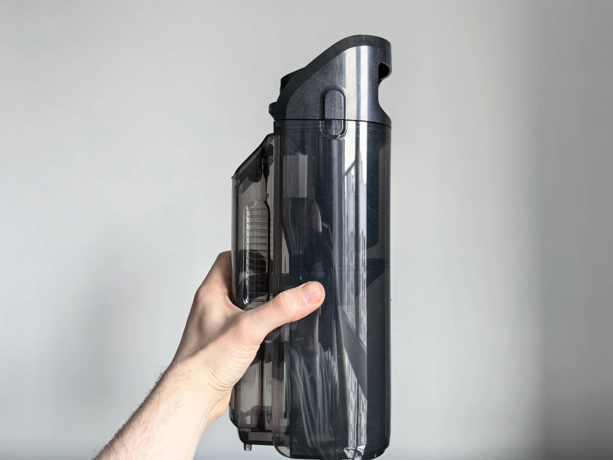 Контейнеры для твердого мусора и грязной воды разделены, а полезный объем резервуара в горизонтальном положении ограничен 350 мл, чтобы избежать переливов, а в вертикальном равен 500 мл. Они легко снимаются и промываются под краном без лишней возни. Главное перед использованием просушить резервуар для мусора, чтобы грязь и прочий мусор не прилипали к стенкам.