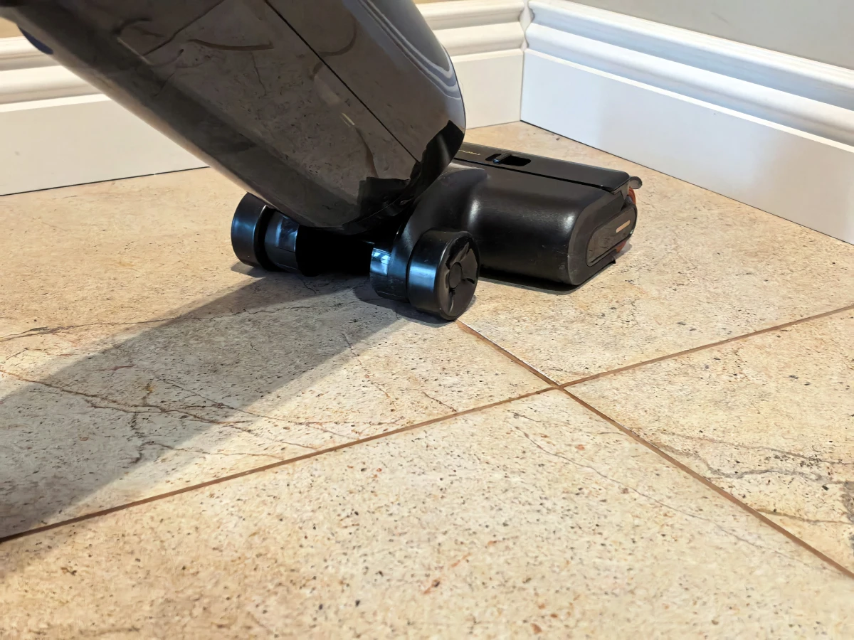 Рабочий валик спроектирован с умом: он позволяет убирать грязь вдоль плинтусов и стен с обеих сторон — никаких «слепых зон» по краям не остается. Это будет полезно, если дома есть кот, который обильно линяет или если вы много готовите и упавшие на пол капельки томатной пасты и жира — распространенный сценарий.